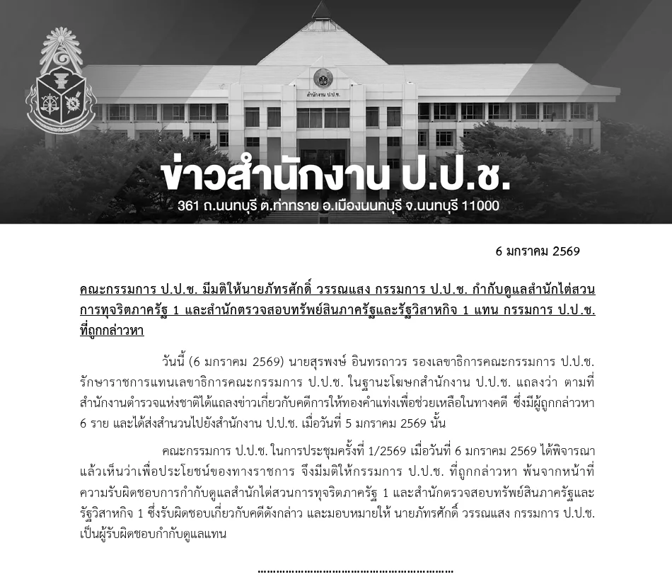 จากการประชุมคณะกรรมการ ป.ป.ช. ครั้งที่ 1/2569 วันที่ 6 มกราคม 2569 พบว่ามีกรรมการ ป.ป.ช. ที่ถูกกล่าวหาเกี่ยวข้องกับคดีสินบนทองคำ ซึ่งคณะกรรมการเห็นว่าเพื่อ ประโยชน์ของทางราชการและความเป็นกลางในการตรวจสอบ จึงมีมติให้กรรมการที่ถูกกล่าวหา พ้นจากหน้าที่ความรับผิดชอบ